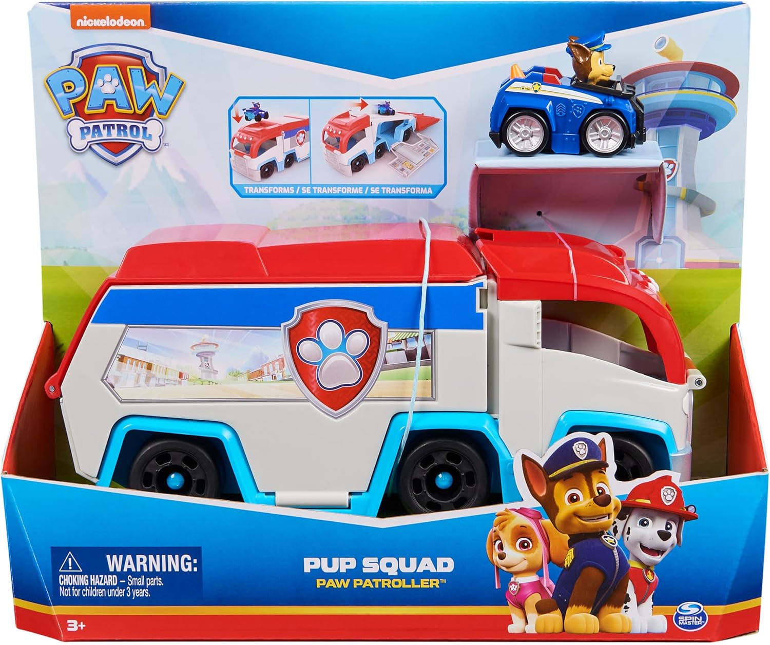VEHÍCULO DEL EQUIPO PAW PATROL: ¡El auto de carreras Pup Squad PAW Patroller & Chase presenta un diseño y estilo genuinos de PAW Patrol, por lo que estos autos de juguete lucen tal como se ven en el programa!, CAMIÓN DE JUGUETE TRANSFORMANTE: ¡ ¡Presenta una emocionante transformación! ¡Pon a Chase en el techo de la cabina para activar la rampa trasera y las paredes para almacenamiento adicional del vehículo