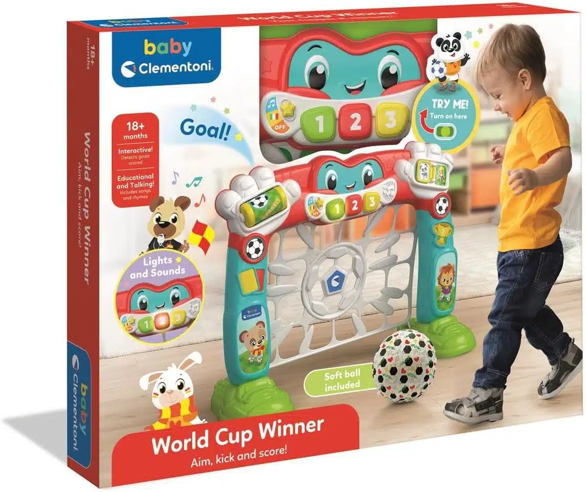 Portería de Fútbol Interactiva: Equipado con un sensor óptico, este juego educativo reconoce cuando se marca un gol, haciendo que la red se mueva. Incluye una pelota extrasuave, perfecta para niños a partir de 18 meses y un centro de actividades con muchas luces y sonidos estimulantes. Ideal para desarrollar habilidades motoras y coordinación