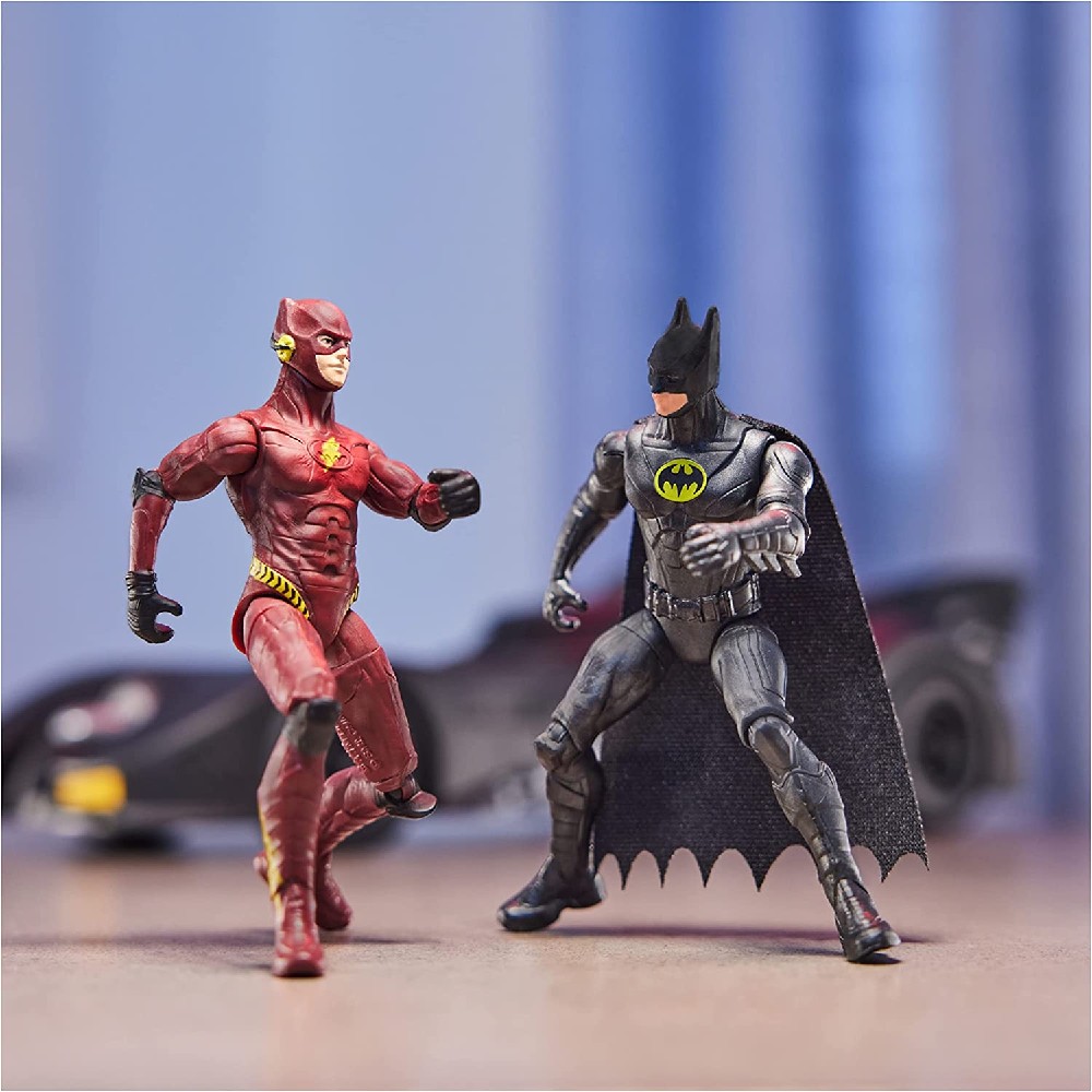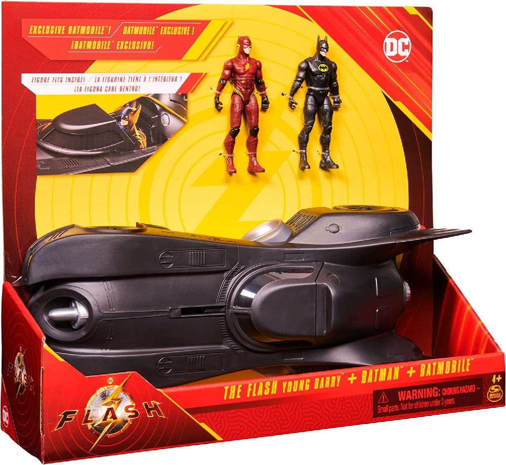 Pack en el que encontrarás el batmóvil con espacio para un personaje y las figuras de Flash y Batman. Las figuras tienen un tamaño de 10 cm aproximadamente y son articuladas. Recomendado a partir de 4 años.