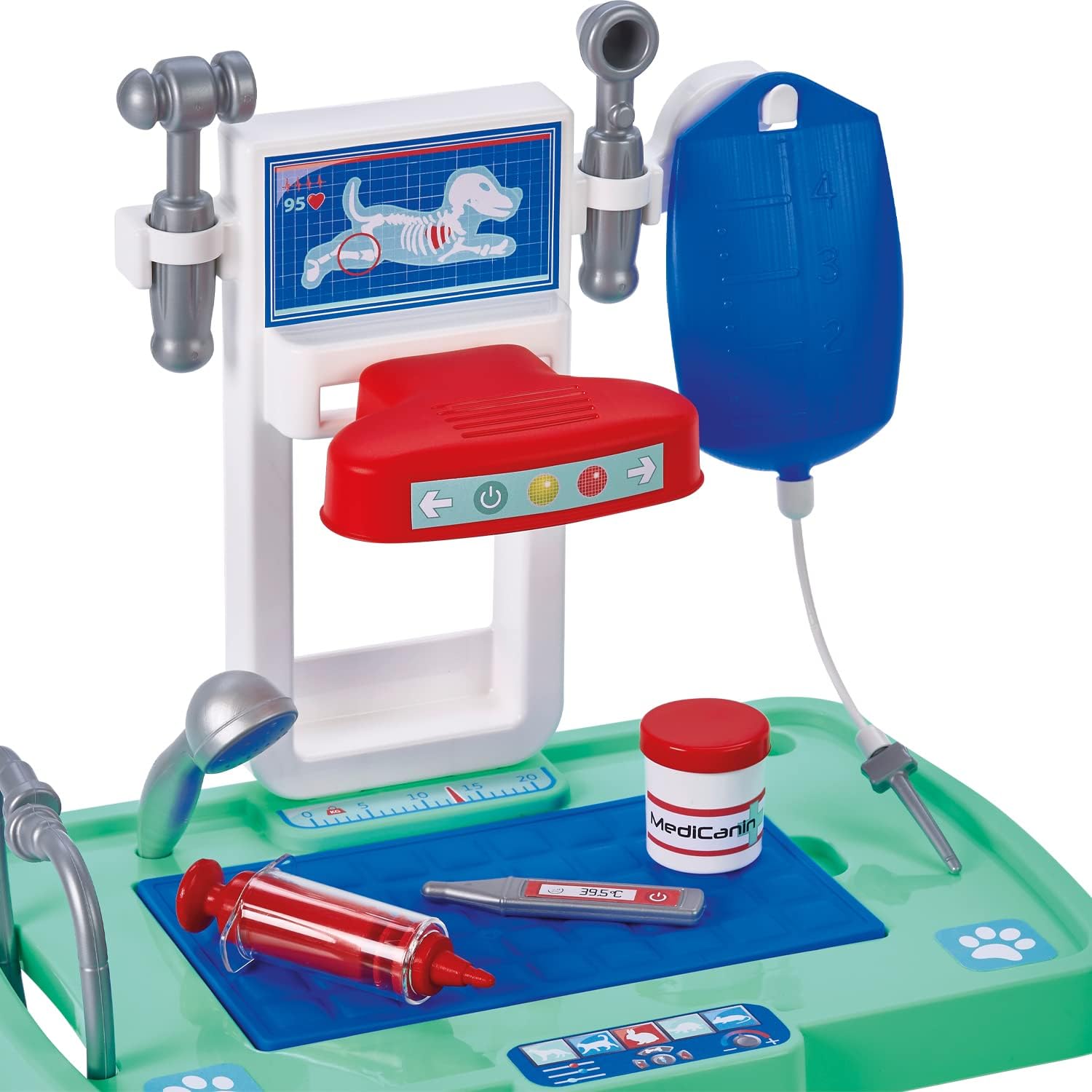 En el versátil centro veterinario de Ecoiffier, tus peluches favoritos pueden ser cuidados y tratados El centro veterinario está equipado con una mesa de atención y un trasportín. También se incluye un perro de peluche Además, el hospital veterinario tiene un estetoscopio, un bote de medicina, un termómetro y varios instrumentos de examen