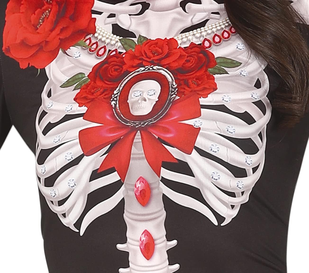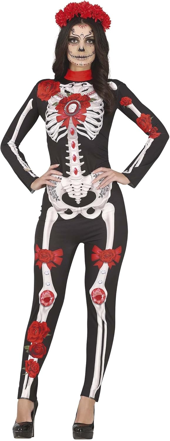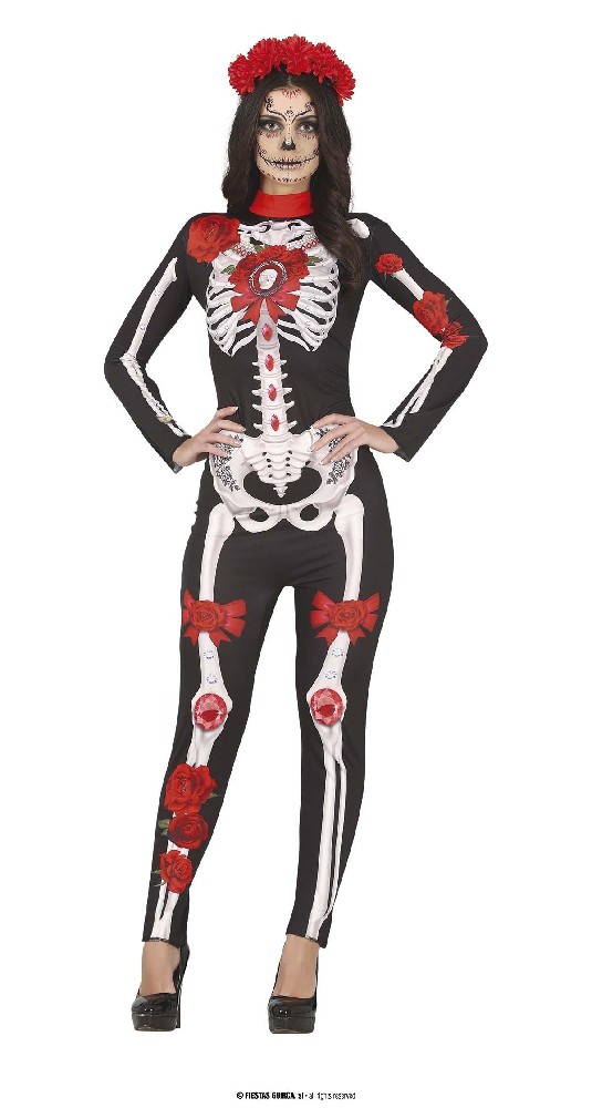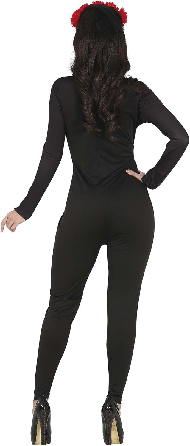 CONTENIDO DEL DISFRAZ de catrina : Mono Largo con Estampado de Esqueleto, Flores y Joyas – Estilo Día de los Muertos