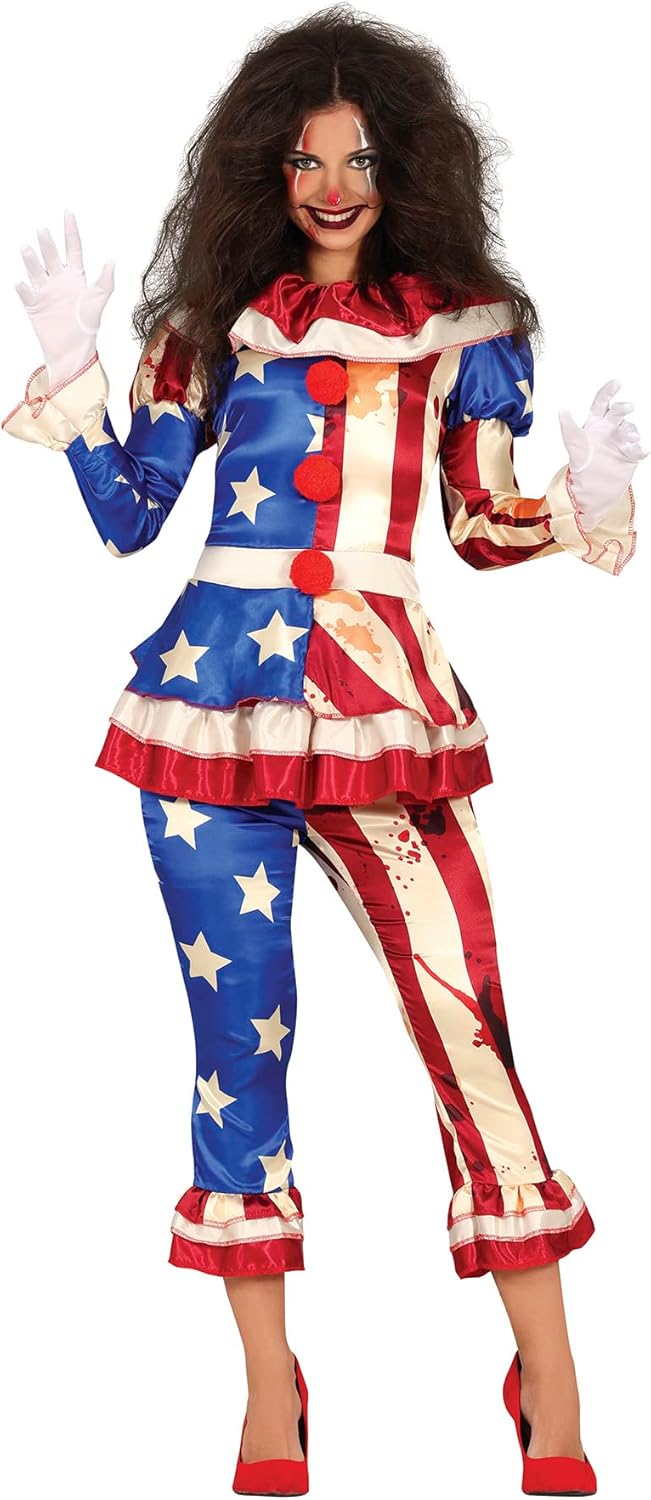 DISFRAZ PAYASA ASESINA PATRIOT T.M 38-40 CONTENIDO DEL DISFRAZ de payaso americano malvado: túnica con cuello, pantalón. NO_INCLUIDO: guantes MATERIALES: Este disfraz de Carnaval o Halloween para adultos está hecho de poliéster y cumple con los estándares de seguridad para que puedas divertirte a lo grande en tu próxima fiesta de disfraces.