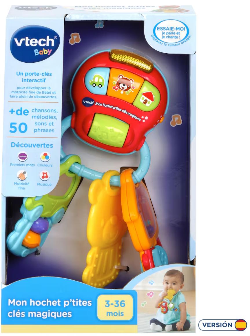 El llavero incluye 3 llaves con accesorios diferentes: un mordedor para calmar las encías, un espejo para bebés y cuentas de colores que hacen ruido al moverlas. Además, al agitar el llavero o pulsar sus 3 botones luminosos, se activan frases, canciones, melodías y sonidos divertidos.