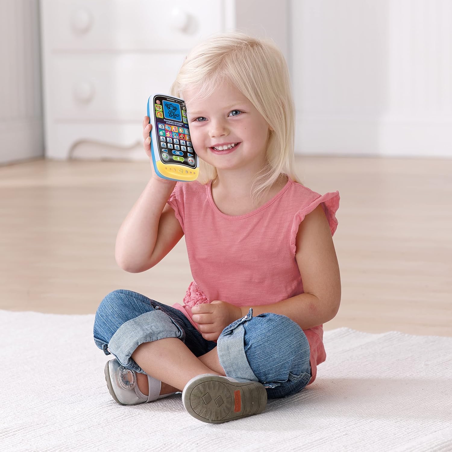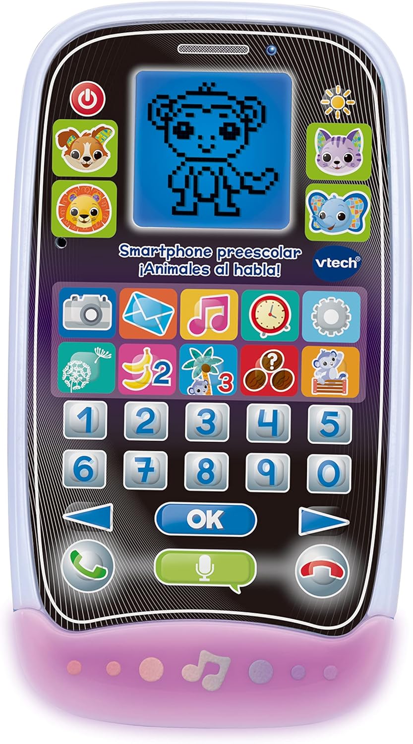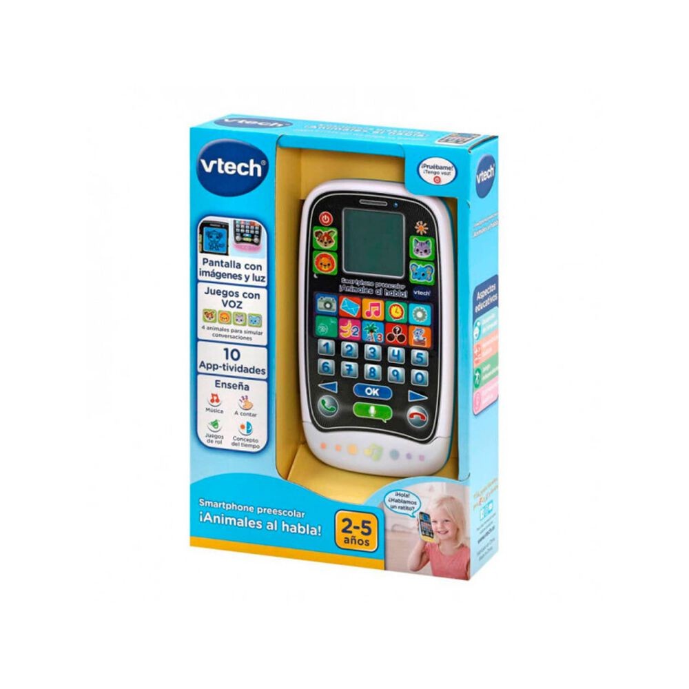 ? VERSIÓN ESPAÑOLA. Teléfono inteligente educativo, Juguete para niños +2 años. APP-TIVIDADES: Smartphone con aplicaciones que imitan actividades de la vida real como la meditación, el ejercicio físico o la práctica de la fotografía entre los personajes del teléfono. JUEGOS DE APRENDIZAJE: Aprende las horas a través de un simpático personaje. El smartphone consta de divertidos juegos a través de la interacción con cuatro animales que simulan conversaciones entre ellos, hacen fotos, practican carreras de obstáculos, trepan por árboles… y todo para desarrollar la coordinación ojo-mano, contar, lógica y mucho más. ¡VAMOS A HABLAR! Voces para chatear con tu amigo el mono. PANTALLA LCD: Smartphone interactivo para preescolar con pantalla LCD imágenes, luces y voces. PERSONALÍZALO: Personaliza tu teléfono eligiendo el tono, contraste y música de fondo. PADRES SEGUROS, PADRES VTECH – SEGURIDAD Y EDUCACIÓN: Desarrollamos juguetes educativos e interactivos para que los más pequeños aprendan mientras se divierten y jueguen con total seguridad. ASPECTOS EDUCATIVOS: Desarrollo del lenguaje, Matemáticas básicas, Juego independiente y Estimulación auditiva. VTECH CUIDA DEL PLANETA: En VTech trabajamos para reducir nuestro impacto medioambiental, como parte de un enfoque eco-responsable.