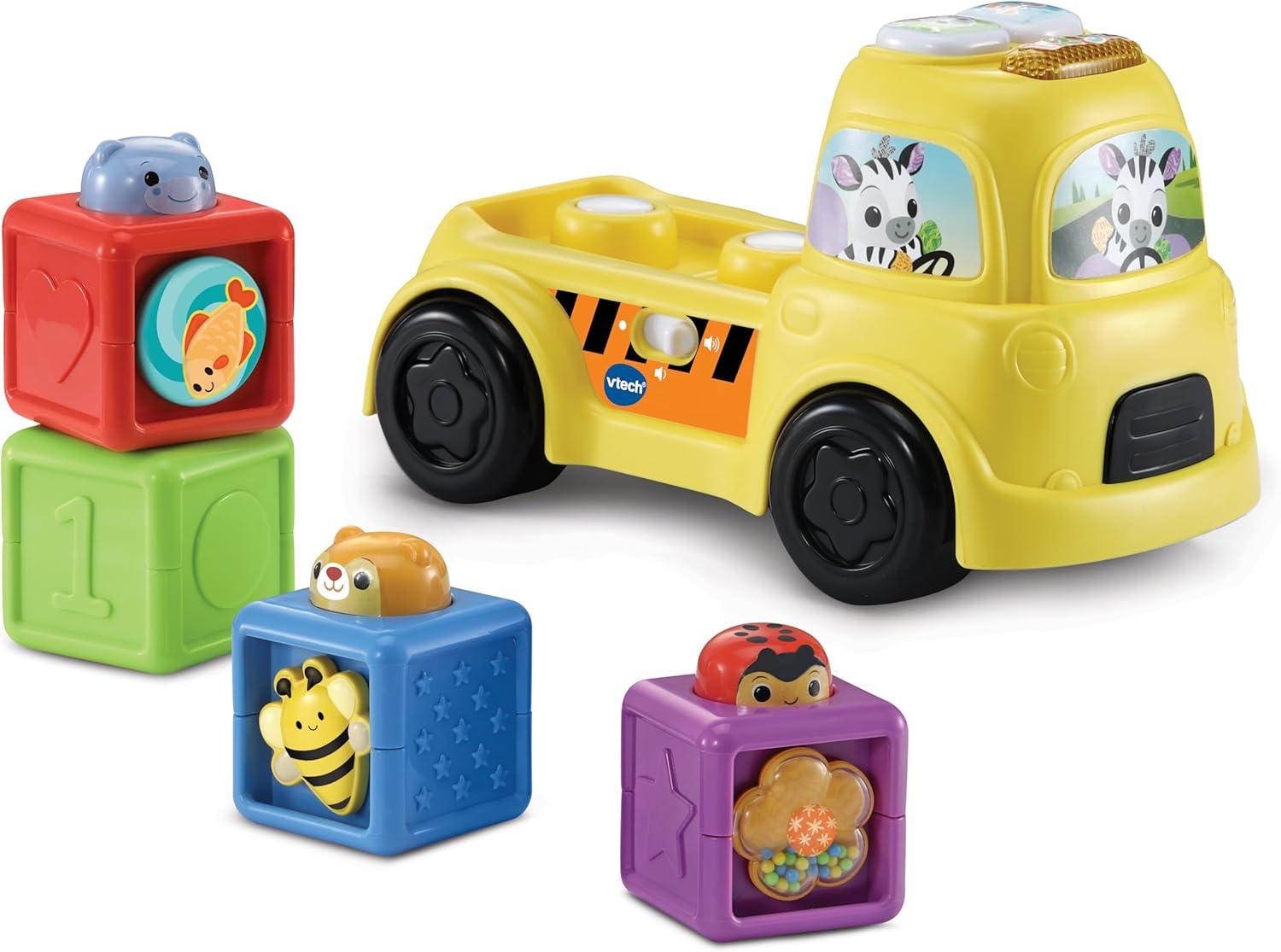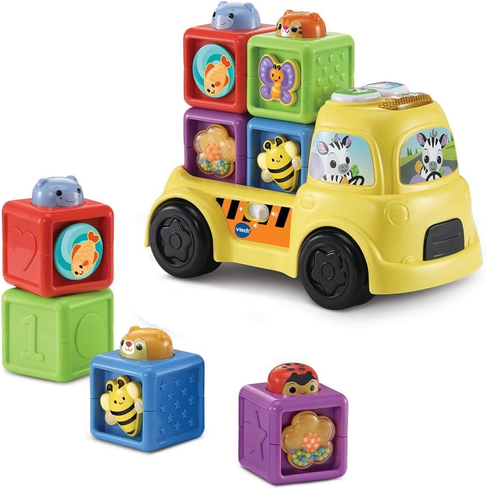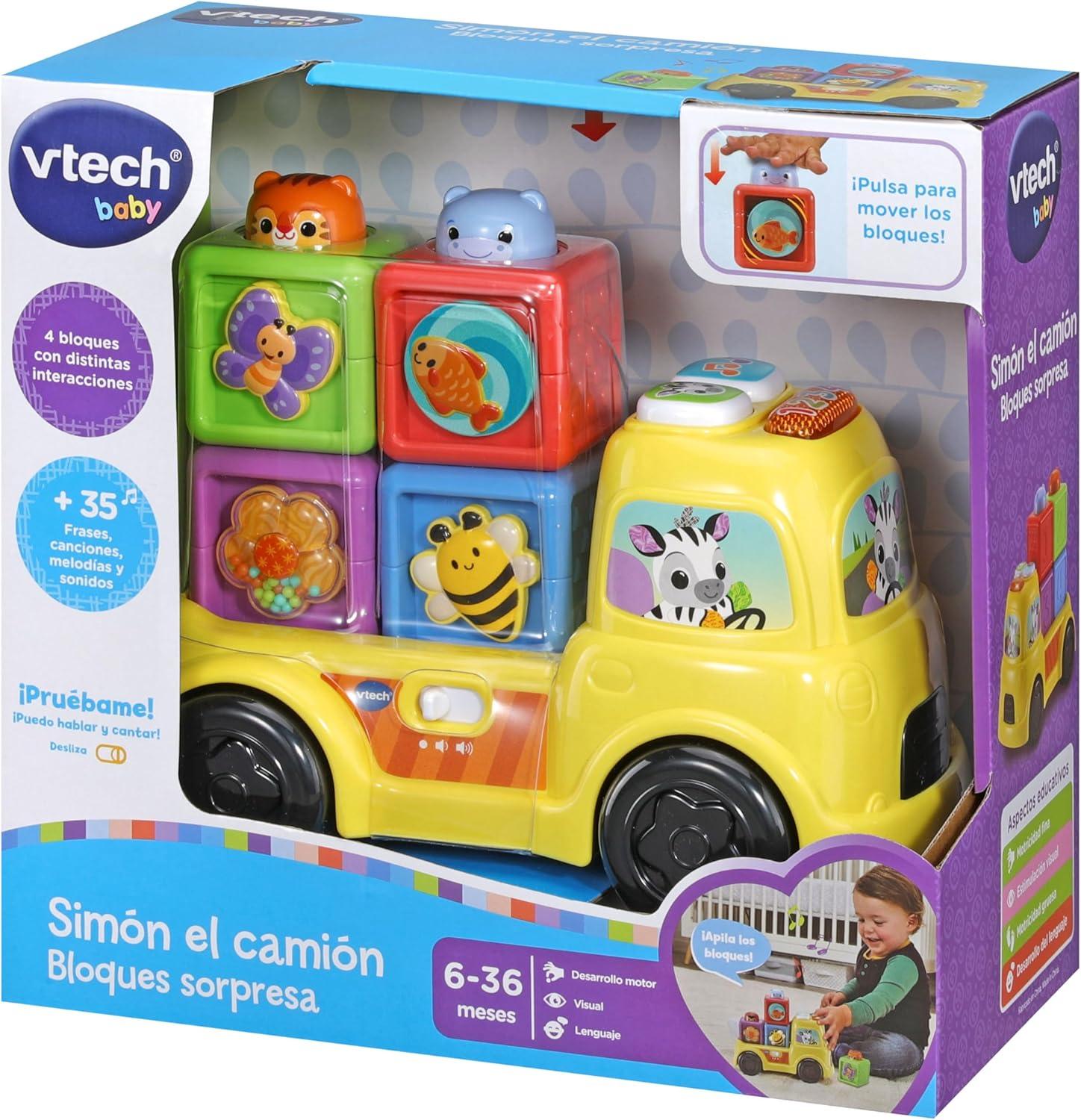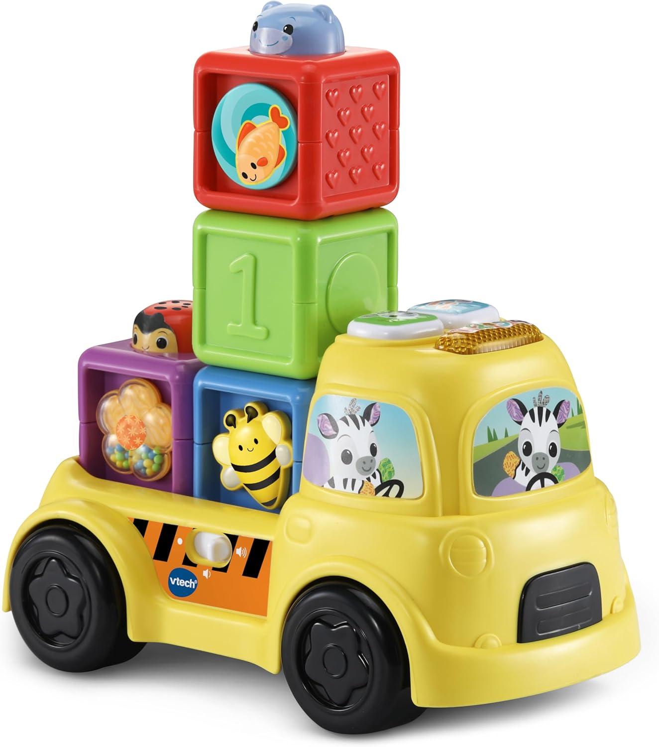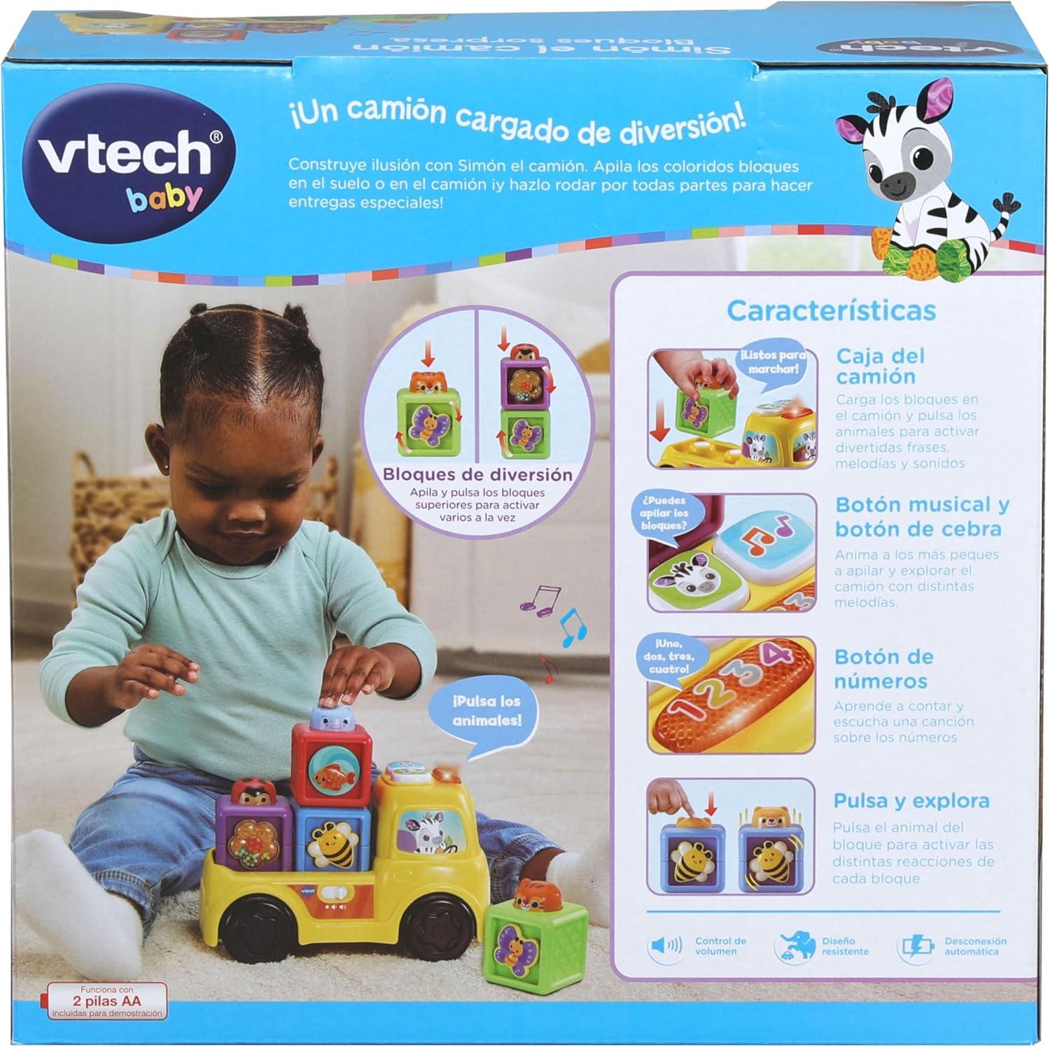 Desde los seis meses, este camión apilable convierte el suelo en un divertido escenario de construcción. Sus cuatro bloques con animalitos, cada uno con texturas, sonajeros o sorpresas, animan al bebé a agarrar, sacudir y encajar, fortaleciendo la coordinación ojo-mano y el control de sus deditos. Al dejar los bloques en la caja, luces y sonidos celebran la acción y estimulan la curiosidad causa-efecto. Tres botones lanzan canciones y frases que presentan números y primeras palabras, sembrando el gusto por el lenguaje. Al empujar el camión, el peque gatea tras él, practica equilibrio y ve cómo se mueve su carga. Desconexión automática para jugar con tranquilidad. Funciona con 2 pilas AA incluidas (pilas de demostración). Recomendado a partir de 6 meses.
