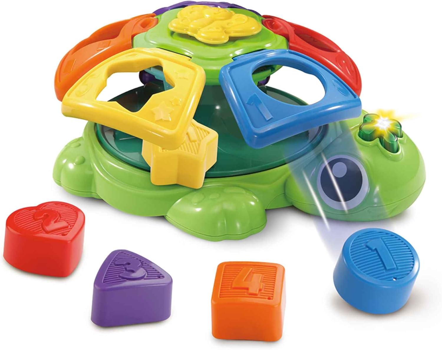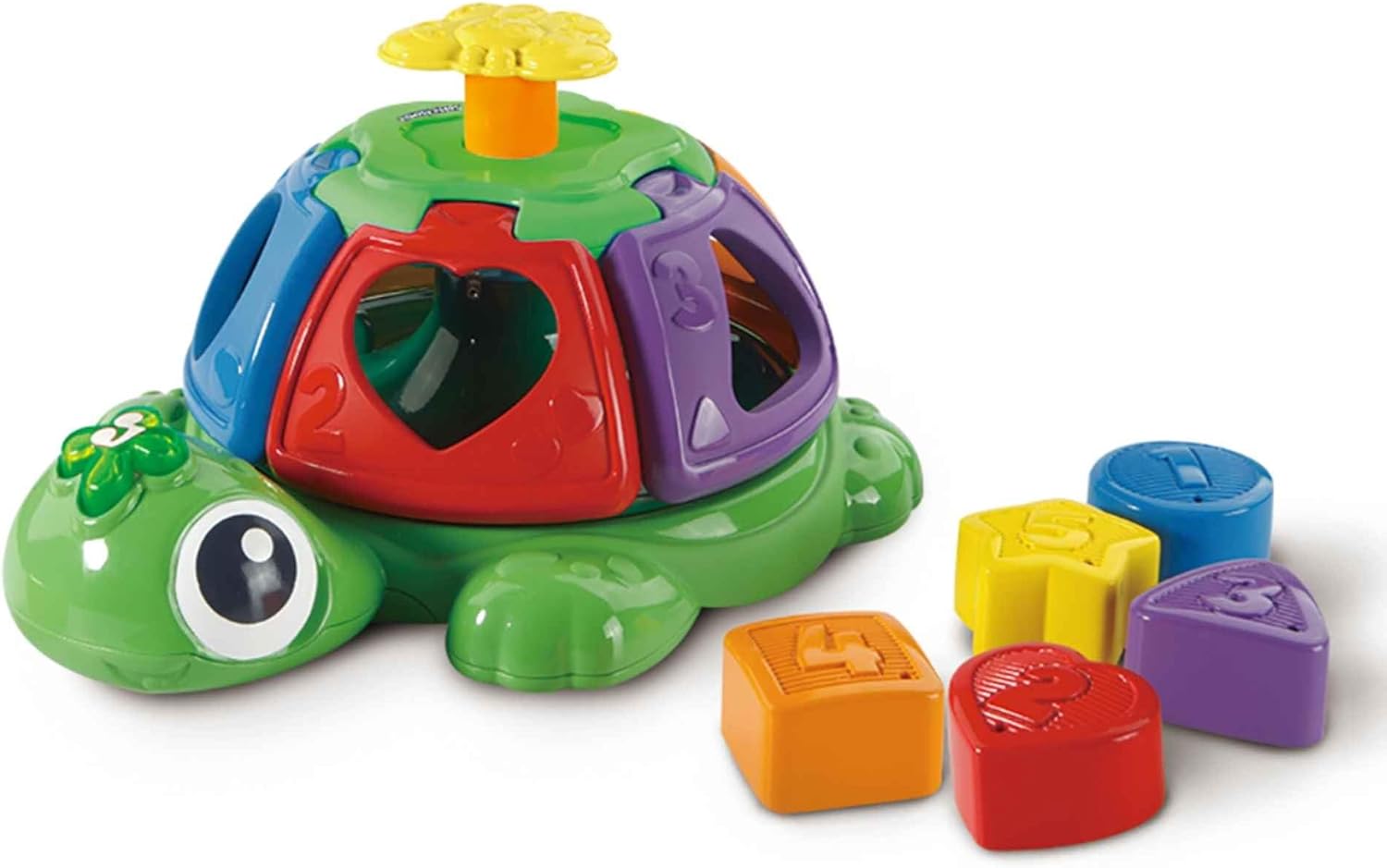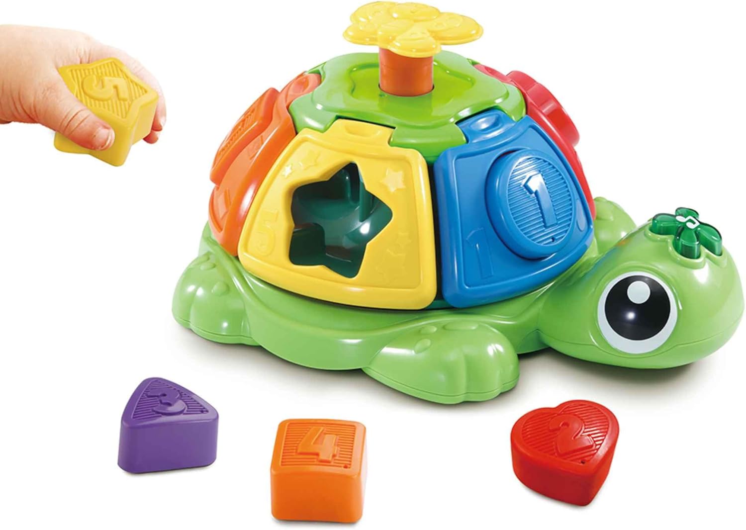 – Con 5 bloques para encajar en el caparazón de la tortuga, que enseñarán números, colores y formas.