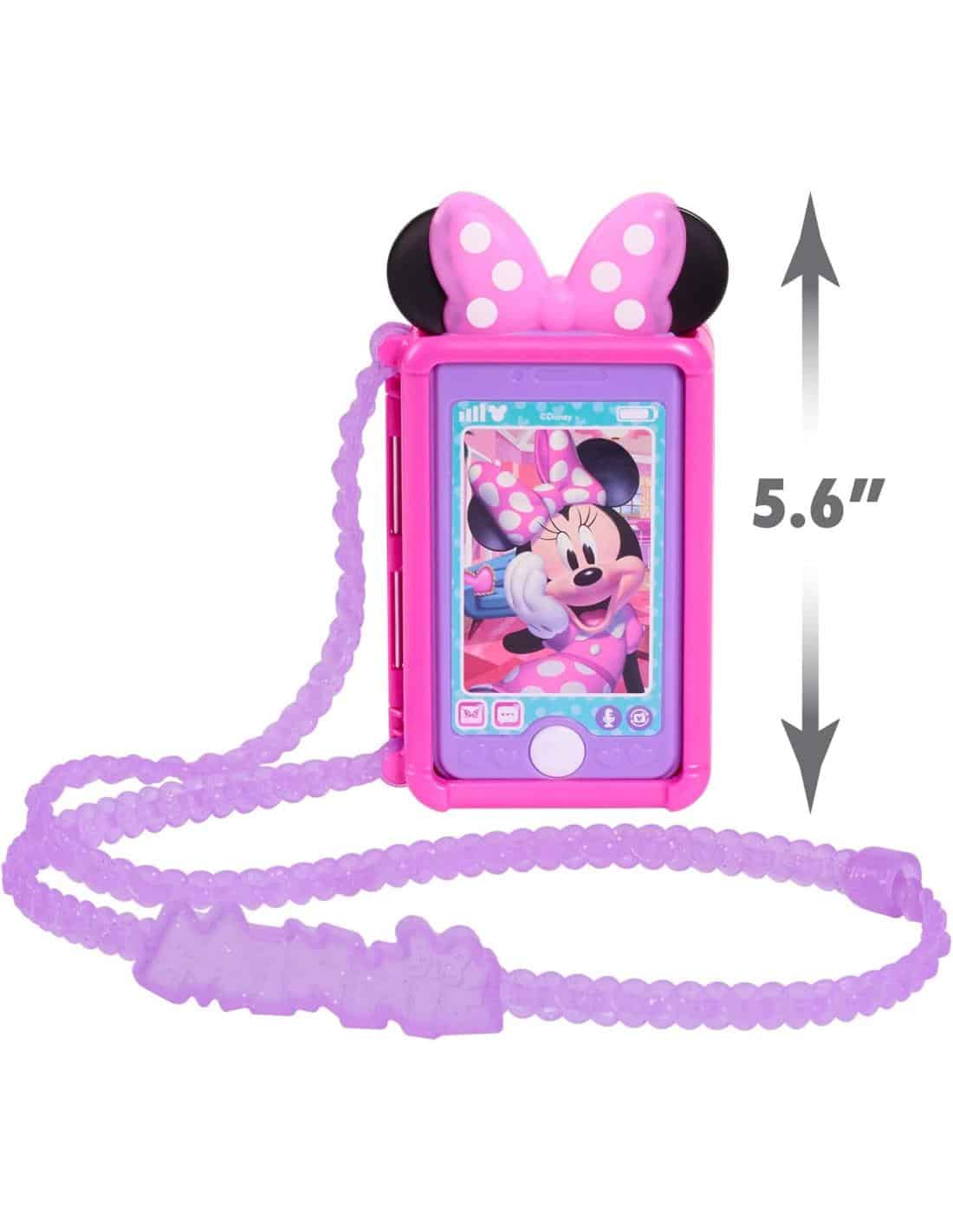 Este teléfono destaca por su diseño colorido y atractivo, con la imagen de Minnie en pantalla, sus icónicas orejas y su lazo de lunares. La funda incluida permite guardar y transportar el juguete cómodamente, añadiendo un extra de diversión.
