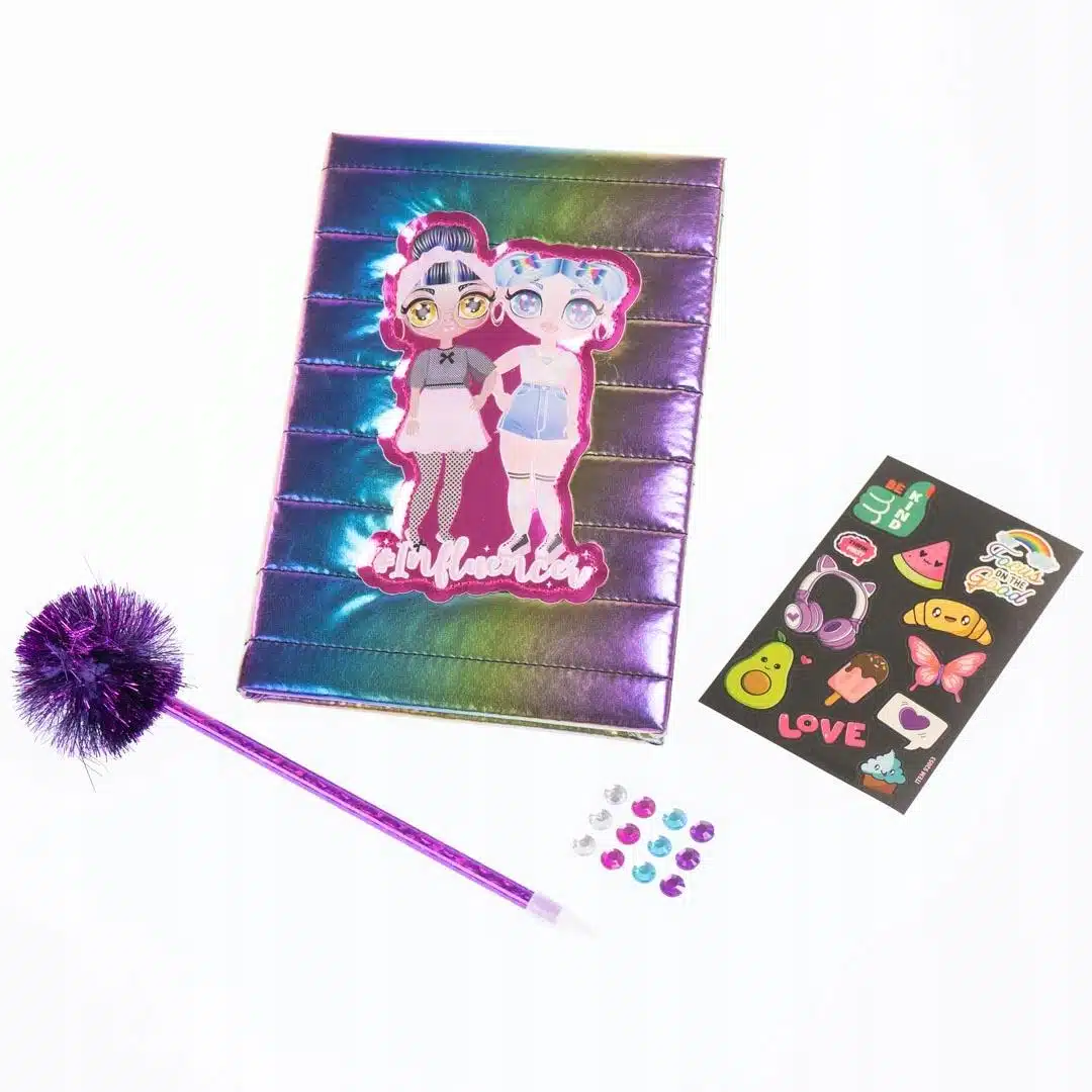 Diario con una suave cubierta de tela iridiscente y un estampado de Influencers. Disponible en varios modelos, envío según disponibilidad. PRECIO POR UNIDAD
