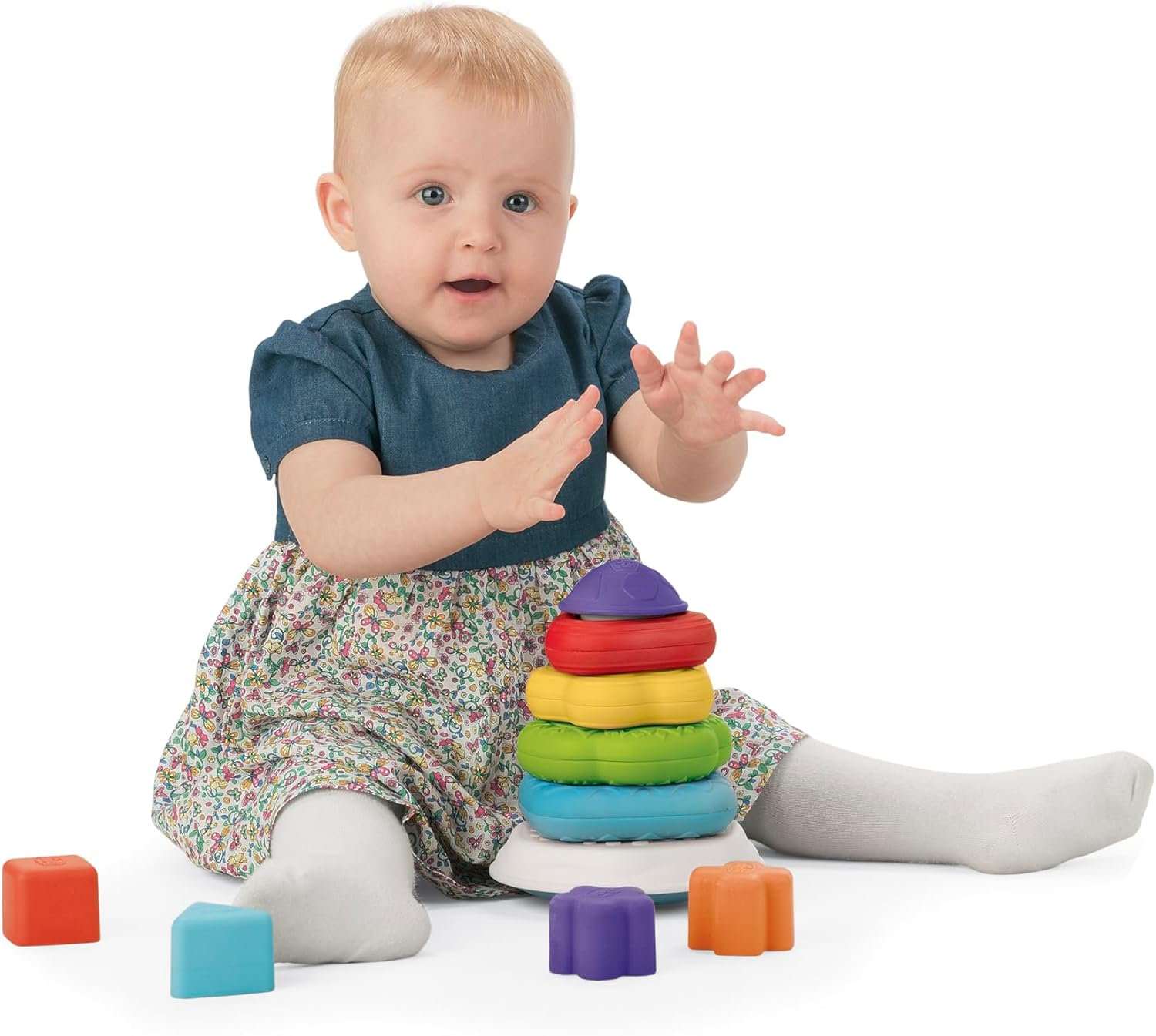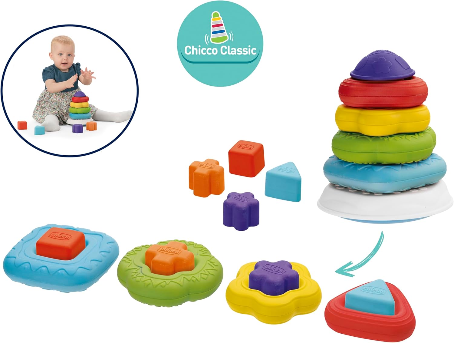 Chicco Pirámide de Anillos 2 en 1, Juguete Infanitl Apilar Anillos y Clasificar Formas, 4 Anillos de Plástico de Colores y 4 Formas Diferentes, Juego Construcción – Juguete para Niños de 6 a 36 Meses