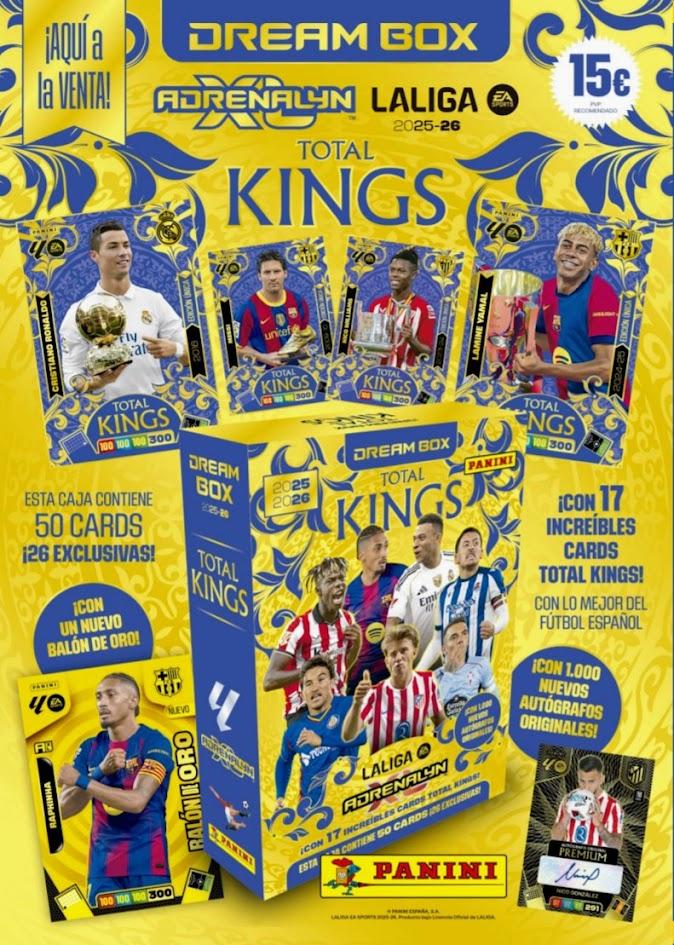 La Dream Box Adrenalyn XL LaLiga EA Sports 2025/26 de Panini es una edición imprescindible para coleccionistas y aficionados al fútbol español. Esta colección oficial Panini llega en una versión exclusiva de tirada limitada, diseñada para quienes buscan conseguir cartas especiales, cards exclusivas y algunos de los mejores homenajes a jugadores icónicos de LaLiga. La espectacular serie TOTAL KINGS convierte esta caja en una auténtica pieza de coleccionista. Cada card rinde homenaje a grandes estrellas del fútbol, recordando títulos colectivos e individuales logrados a lo largo de sus trayectorias. Además, esta edición incorpora Cards Únicas dedicadas a futbolistas inolvidables que han marcado una época sobre el césped. En el interior de esta Dream Box Adrenalyn XL 2025/26 encontrarás un total de 50 cards, de las cuales 26 son exclusivas, lo que la convierte en una opción ideal para ampliar colección, buscar cartas especiales y disfrutar de una experiencia premium de coleccionismo. Contenido de la Dream Box Total Kings Panini: 24 cards Adrenalyn XL Plus 17 cards Total Kings con lo mejor del fútbol español 2 Cards Únicas: De Marcos y Sergio Busquets 3 Nuevos Diamantes: Héctor Fort, Bardghji y Macià 3 nuevas cards Edición Limitada: Barrios, Olmo y Raúl Moro 1 nuevo Balón de Oro: Raphinha Si buscas una caja Adrenalyn XL Panini exclusiva, con gran valor para coleccionar, regalar o completar tu colección oficial de fútbol, esta Dream Box LaLiga EA Sports 2025/26 es una de las opciones más atractivas de la temporada.