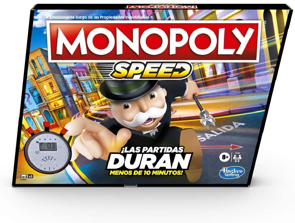 Monopoly- Speed (Hasbro E7033105) No tienes mucho tiempo. No hay problema. El juego de mesa Monopoly Speed se puede jugar en menos de 10 minutos. Todos tiran y compran a la vez, de modo que los jugadores no tienen que esperar su turno. Durante 4 rondas, los jugadores corren contra el cronómetro para comprar, negociar y vender propiedades más rápido que nunca. El cronómetro hace una cuenta regresiva de cada etapa de compra y negociación, y no hay ninguna pausa entre las etapas. Incluso hay 2 casillas “Go” y los jugadores pueden salir en libertad de la Cárcel cada vez. El juego de mesa Monopoly Speed es una estupenda opción para una noche de juegos en familia, fiestas con amigos y una rápida pausa de la cotidianidad. Los nombres y los logotipos de Hasbro Gaming, Parker Brothers y Monopoly, el diseño distintivo del tablero, las cuatro casillas de las esquinas, el nombre y el personaje de Mr. Monopoly, así como cada uno de los elementos distintivos del tablero y piezas de juego, son marcas registradas de Hasbro para su juego de las operaciones inmobiliarias y equipo del juego.