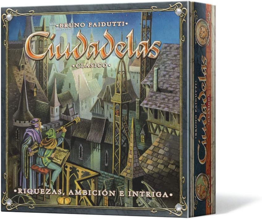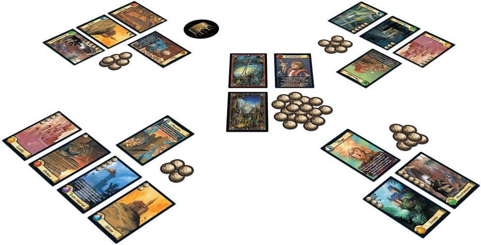 Contiene 8 cartas de personaje, 68 cartas de distrito, 7 cartas de ayuda de juego, 1 ficha de corona y 30 fichas de monedas de oro
