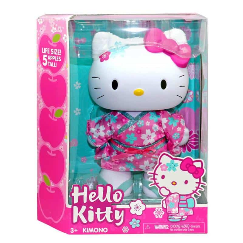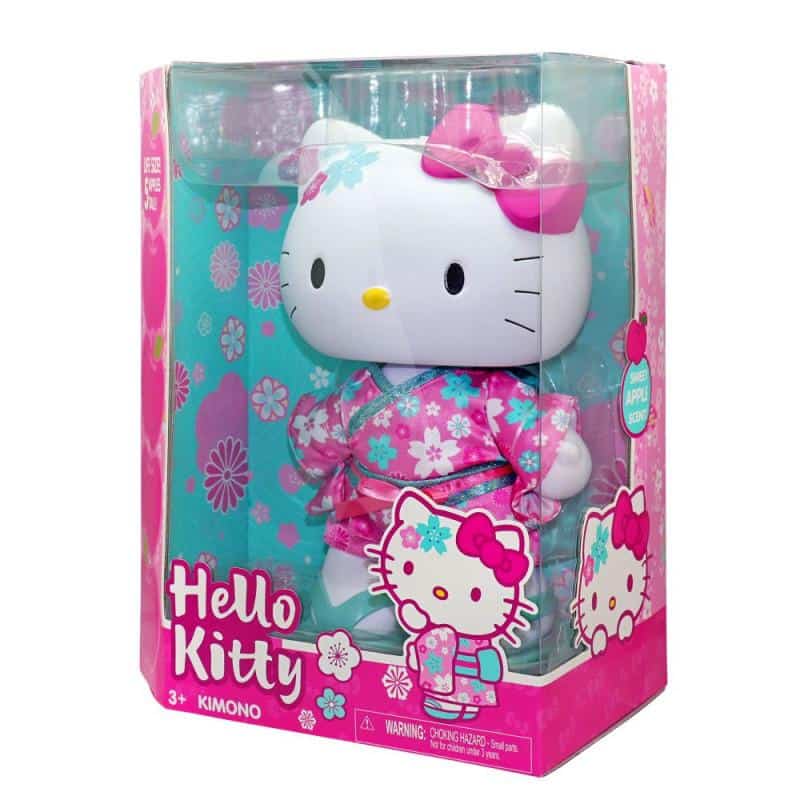 Muñeca Hello Kitty de 32 cm con 5 puntos de articulación. Viste un precioso kimono y sandalias, que se pueden quitar. La muñeca huele a manzana.