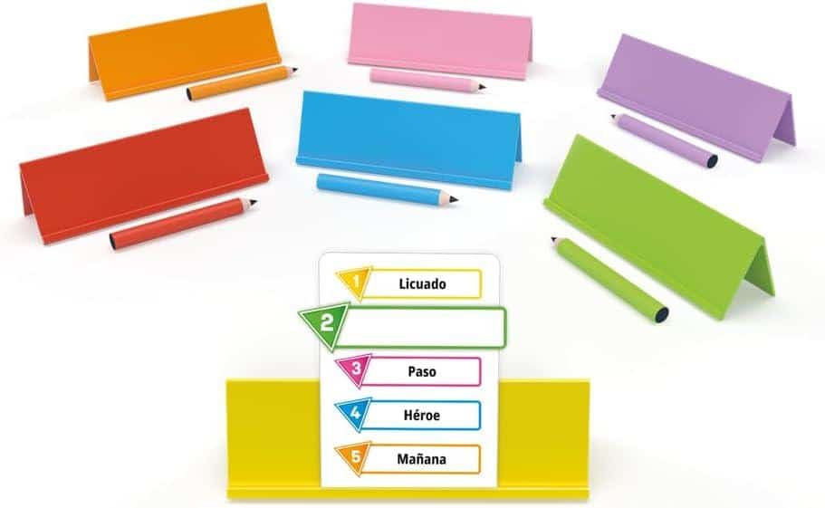 110 cartas, 7 atriles, 7 rotuladores borrables, 7 borradores, reglamento