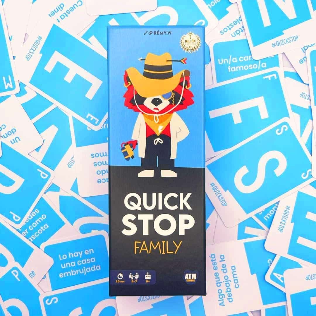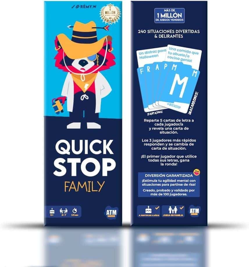 Juego Quick Stop Family 240 situaciones divertidas & delirantes Reparte 5 cartas de letra a cada jugador/a y revela una carta de situación. Los 3 jugadores más rápidos responder y se cambia de carta de situación. ¡El primer jugador que utilice todas sus letras, gana la ronda! DIVERSIÓN GARANTIZADA ¡Estimula tu agilidad mental con situaciones para partirse de risa! Creado, probado y validado por más de 100 jugadores. Contenido 240 cartas