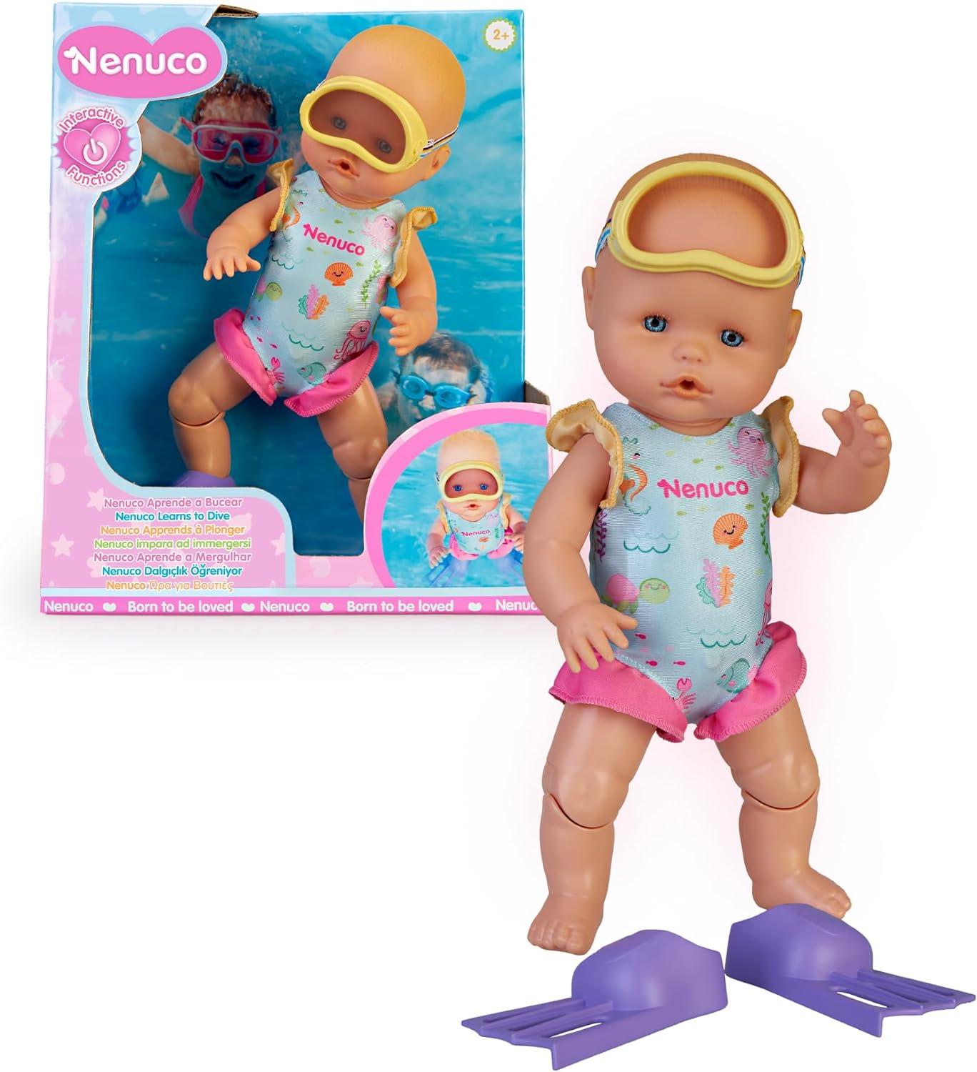 Nenuco – ¡Aprende a Bucear! Muñeco de 35 cm y Cuerpo Duro Que Mueve Sus piernas y Nada solito. con tu Ayuda podrá sumergirse en el Agua y bucear. Incluye bañador, Aletas y Gafas de bucear (NFN75000)