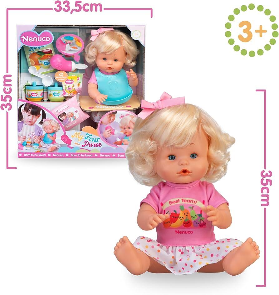 ¡Nenuco ya puede comer su primera papilla! Prepara comida de verdad para Nenuco con todos los accesorios incluidos, ponle su babero y dale la papilla con su cuchara biberón y al terminar¡limpiale la carita y a seguir jugando! Nenuco Mi Primera Papilla es un Nenuco de 35cm y cuerpo duro tiene un precioso pelo rubio rizado y lleva un vestidito rosa y un lazo en el pelo.