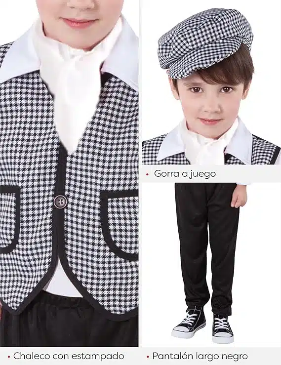 INCLUYE: Traje clásico para niños compuesto por chaleco con doble abotonadura de estampado de cuadros en color negro y blanco con camisa adjunta (en una sola pieza). Pantalón largo en color negro. Gorra incluida. Disfraz adecuado para largas jornadas de diversión. Debidamente empaquetado en bolsa de percha.*PAÑUELO NO INCLUIDO