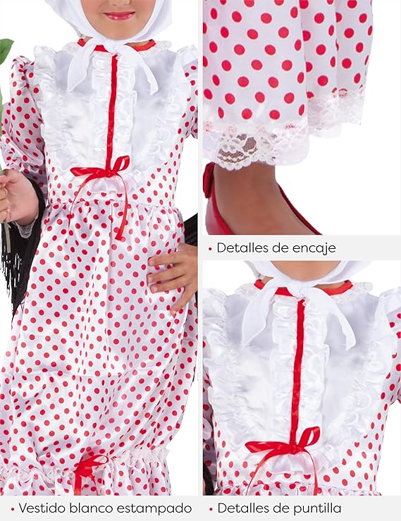 VESTIDO: Precioso vestido largo para niñas, en color blanco con estampado de lunares rojos. Detalles de puntilla de color blanco en muñecas, cuello y falda. Disfraz adecuado para largas jornadas de diversión. Debidamente empaquetado en bolsa de percha.