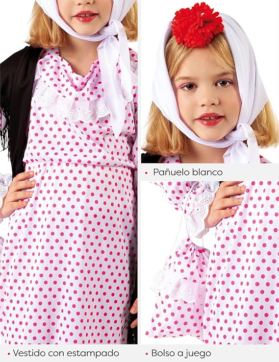 ACCESORIOS: Para complementar su disfraz de Chulapa, su chal, pañuelo y clavel son esenciales y van incluidos. El chal con detalles de flecos en color negro hecho de tejido de polyester y pañuelo blanco también en polyester para que las niñas vistán cómodas en festividades. Además, incluye clavel en color rojo para adornar.